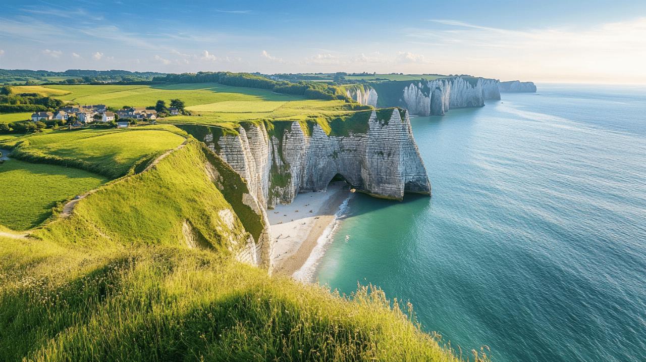Les falaises d'Étretat figurent parmi les joyaux naturels de la Normandie et proposent des sentiers de randonnée exceptionnels. Ces formations calcaires impressionnantes, qui ont inspiré de nombreux artistes comme Claude Monet, offrent des points de vue magnifiques sur la Manche. Le sentier du littoral permet d'admirer les trois arches naturelles emblématiques : la Porte d'Aval, la Porte d'Amont et la Manneporte. Les marcheurs peuvent suivre le GR21 qui longe la côte et propose des panoramas saisissants sur les falaises blanches contrastant avec le bleu de la mer. Pour les plus aventureux, la région se prête aussi au vol en parapente, une activité proposée de mars à octobre avec des moniteurs expérimentés pour des vols en tandem d'environ 20 à 30 minutes au-dessus de ce paysage grandiose.